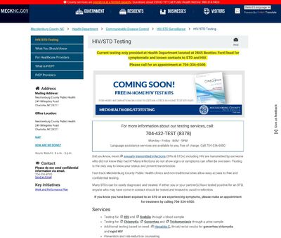Description: Public Health Department/Social Services Department. Free HIV/Syphilis testing is available daily. Testing is provided on a walk-in basis - no appointment is necessary, but appointments are available by calling 704-336-6500. At this time no walk-in testing until further notice; testing only available by appt