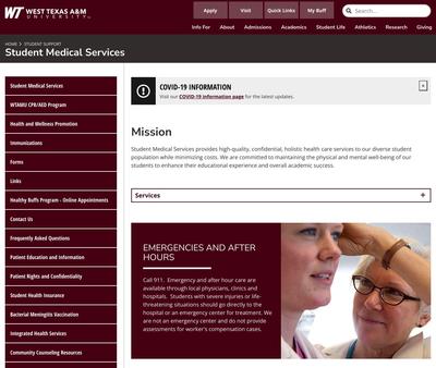 Student Medical Services ensures students at West Texas A & M University receive quality, confidential, and holistic healthcare services at affordable rates. It has board-certified medical staff who aim to meet students' individual health needs. HIV/STD screening services are accessible by male and female students if needed.