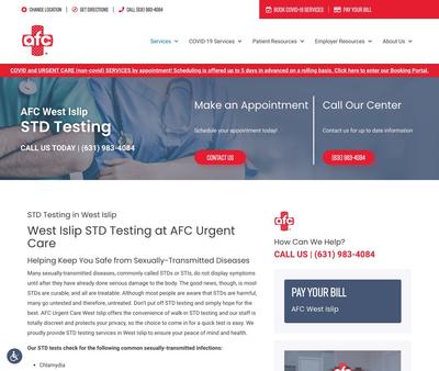 AFC Urgent Care West Islip is a locally owned and operated health center providing urgent care and non-emergency health care services. The facility entails modern diagnostics, electronic medical records, and high-tech x-rays. Its collect urine, blood, or tissue samples to screen for HIV or STDs. The physicians perform all tests in a judgment-free environment to give clients peace of mind.