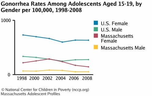 There were 3,688 cases of Gonorrhea reported in Massachusetts in 2015 at a rate of 81.3 per 100,000 population. Teens and young adults had the highest rates among age groups. The rate for 20 to 24 year olds was 211.9 per 100,000 population, compared to 54.3 in all ages. The rate for individuals aged 25 to 29 years old was 178.2 per 100,000 population.