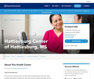 Hattiesburg Center of Hattiesburg, MS, is part of the Planned Parenthood movement that provides access to affordable and quality health-care services. Its medical personnel offers sex education and reproductive health services such as abortion care, family planning, emergency contraception, and comprehensive STD testing and treatment services. Also, physicians are proficient in providing primary care, general health, and LGBTQ services.
