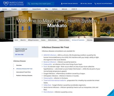 Its care providers deliver quality critical care medicine, advanced trauma care, and inpatient behavioral health services to enhance the health of people and communities in and around North Mankato. The infectious disease department handles infections arising from organ transplantation, surgical procedures, and viral infections, such as HIV.