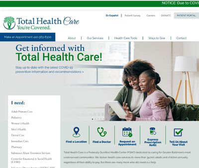Total Health Care Incorporated (Odenton Health Center) is a medical clinic located in Odenton, MD. The clinic offers health care services to locals and patients in surrounding regions. The services include adult primary care, pediatrics, dental care, substance abuse treatment, and infectious disease services. It has been providing services since 1989 when Constant Care merged with West Baltimore Community Health Care Corporation.