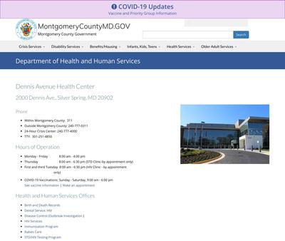 Dennis Avenue Health Center is run by the Montgomery County Department of Health and Human Services. It strives to boost the sexual health of individuals in Montgomery County by providing STD/HIV services.