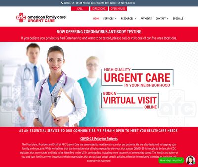 AFC Urgent Care Santee provides affordable urgent care services to men, women, and children in Santee, CA. The facility has certified clinicians who provide services such as flu shots, annual check-ups, pediatric care, immunizations, sports physicals, and STD testing and treatment. Patients experience minimal waiting times before accessing services.