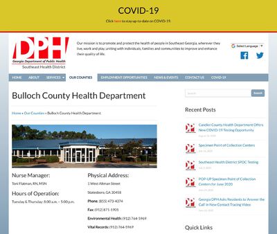 Bulloch County Health Department is a medical facility whose mission is to safeguard and promote the health of persons residing in Northeast Georgia, including Statesboro. Some of the services available include immunizations, womenโs health care, tuberculosis treatment, and colposcopy. Physicians also offer STD testing, diagnosis, and treatment.